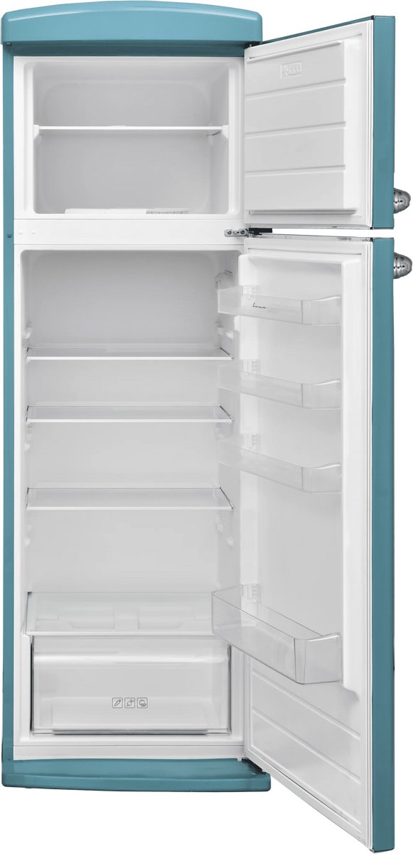 Deze stijlvolle koel-vriescombinatie heeft een slanke afmeting van slechts 60,5 cm breed, 63,5 cm diep en staat stevig op een hoogte van 179,4 cm. Het robuuste blauwe retro design maakt het een echte eyecatcher in elke keuken. De gebruiksvriendelijke draaisysteem bediening en het bijgeleverde eierrekje maken gebruik automatisch en comfortabel.